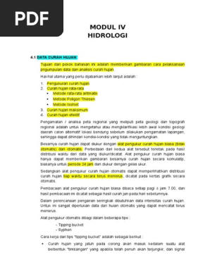 Hidrologi berasal dari Bahasa Yunani. A Karakteristik daerah aliran Catchment Area yang meliputi. Untuk analisa limpasan banjir diperlukan data curah hujan terbesar sehari R24 maximum daily rainfall selama beberapa tahun baik yang dicatat per jam hourly recorded maupun yang dicatat setiap 24 jam daily recorded oleh pos hujan untuk yang berada didalam DAS maupun yang ada di sekitarnya.